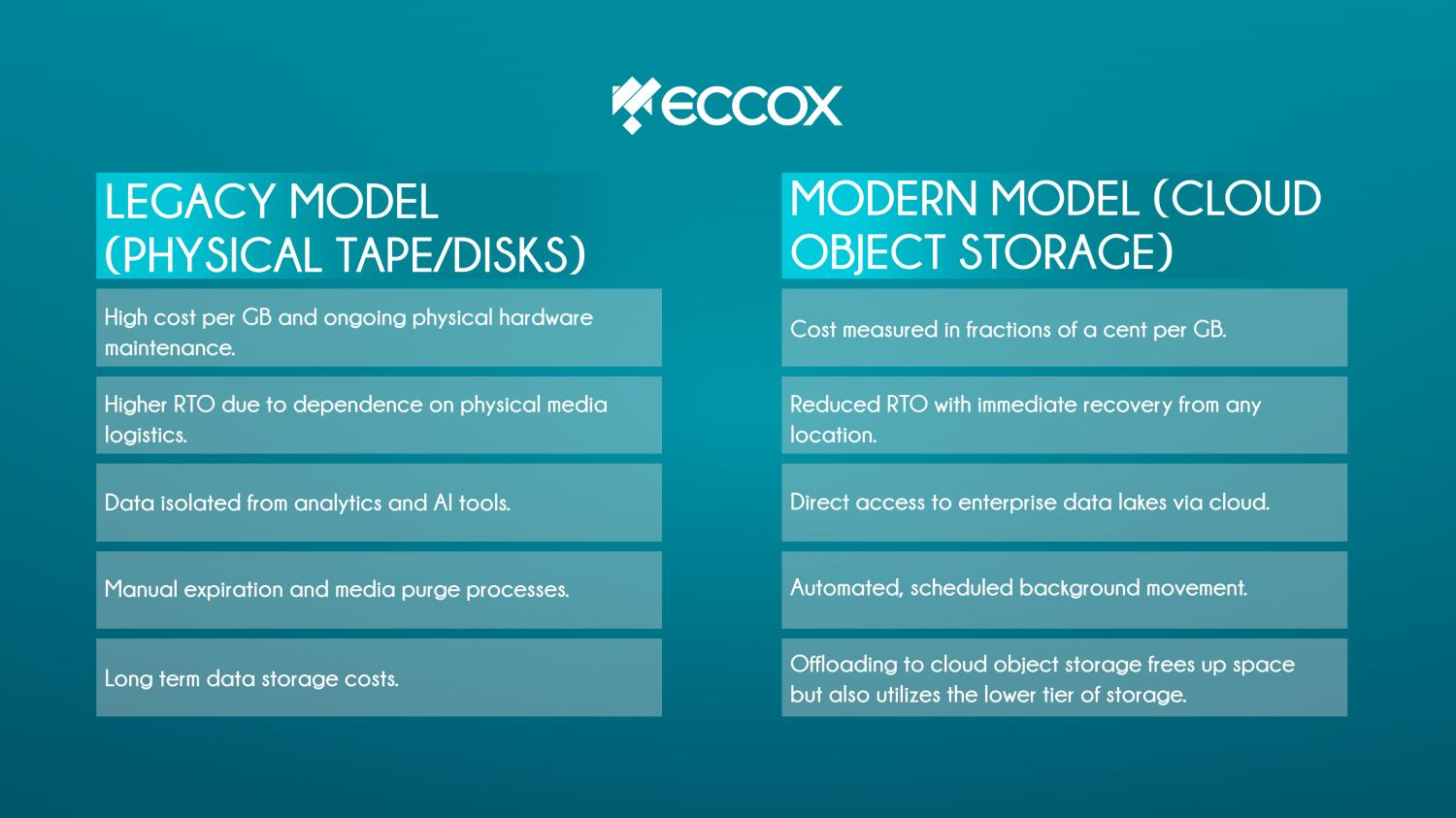 In many organizations, the financial benefits of moving archived data to cloud object storage – particularly when compared with the rising costs of expanding or maintaining storage capacity – can offset modernization investments quickly.