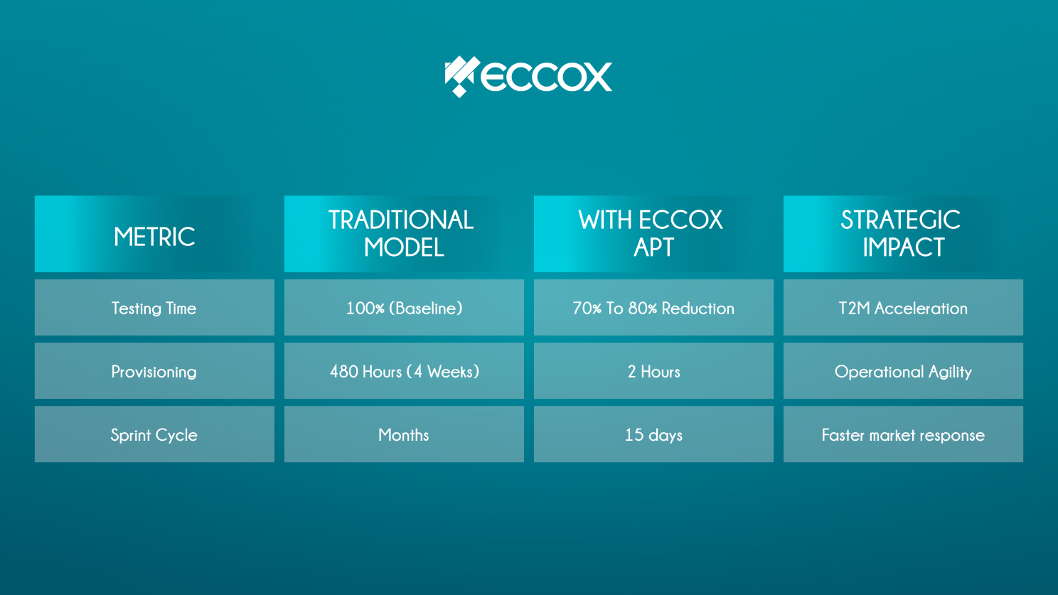 - End of the 21-hour wait: Before Eccox, preparing a testing environment took an average of 21 hours. The solution enabled on-demand, instant test track creation—returning those hours to productive coding and business output.