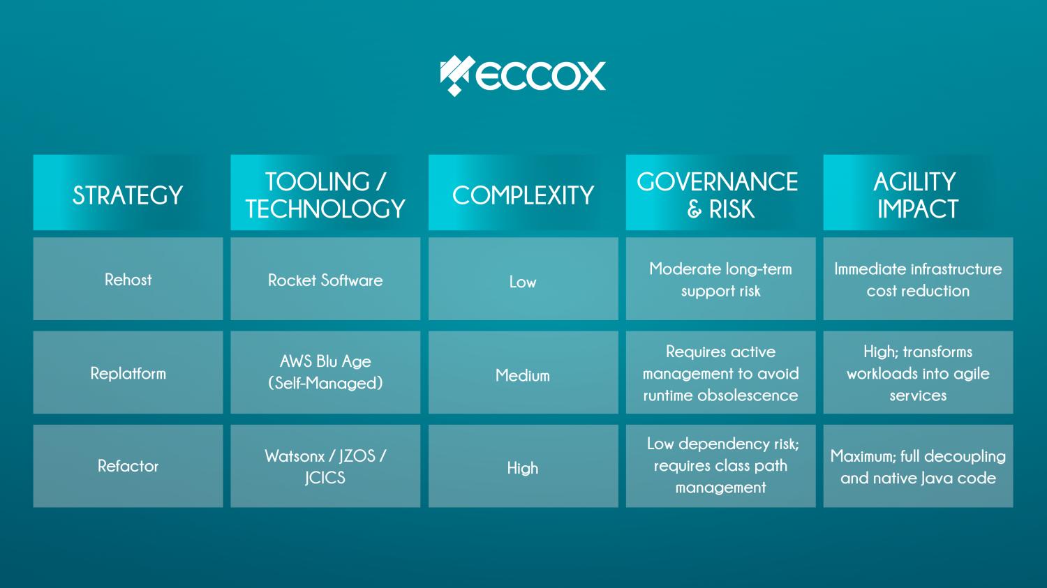 The future integrates AI into automated refactoring and infrastructure optimization. Eccox Technology provides the technical “DNA” that enables engineering leaders and C-level executives to eliminate technical debt and turn the mainframe into an ROI engine for 2025.